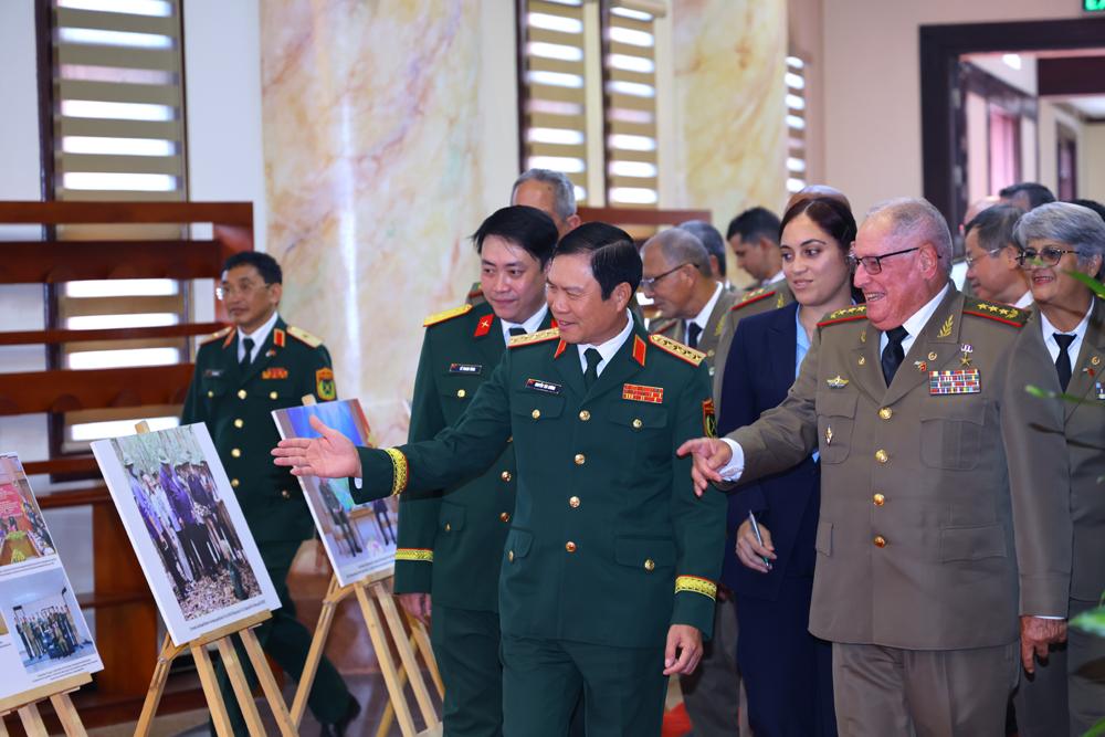 Đại tướng Nguyễn Tân Cương và Thượng tướng Álvaro López Miera tham quan trưng bày ảnh về quan hệ hợp tác giữa hai nước.