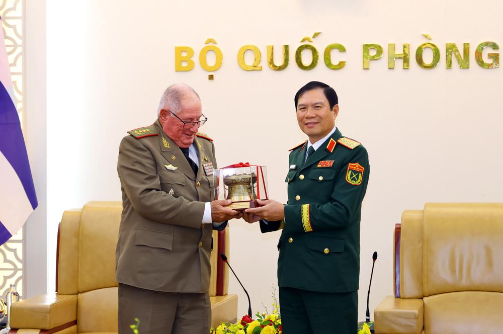 Đại tướng Nguyễn Tân Cương trao quà lưu niệm tặng Thượng tướng Álvaro López Miera.