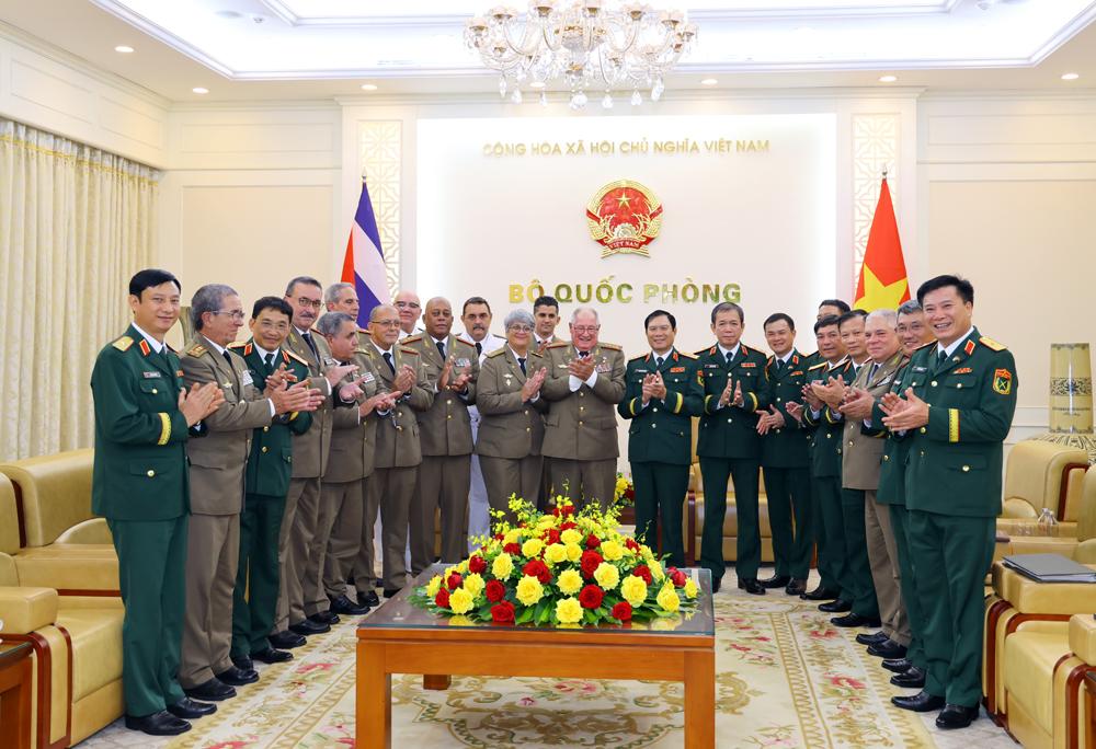 Đại tướng Nguyễn Tân Cương và Thượng tướng Álvaro López Miera chụp ảnh chung cùng các đại biểu.