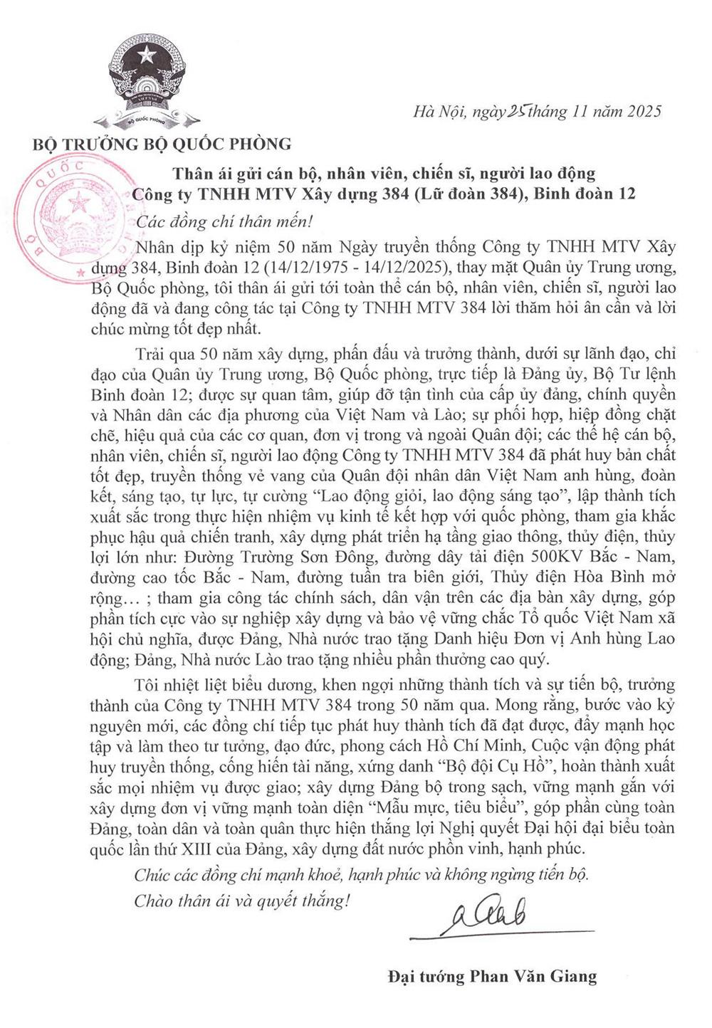 Nhân dịp kỷ niệm 50 năm Ngày truyền thống Công ty TNHH MTV Xây dựng 384, Binh đoàn 12 (14/12/1975 - 14/12/2025), thay mặt Quân ủy Trung ương, Bộ Quốc phòng, tôi thân ái gửi tới toàn thể cán bộ, nhân viên, chiến sĩ, người lao động đã và đang công tác tại Công ty TNHH MTV 384 lời thăm hỏi ân cần và lời chúc mừng tốt đẹp nhất.
