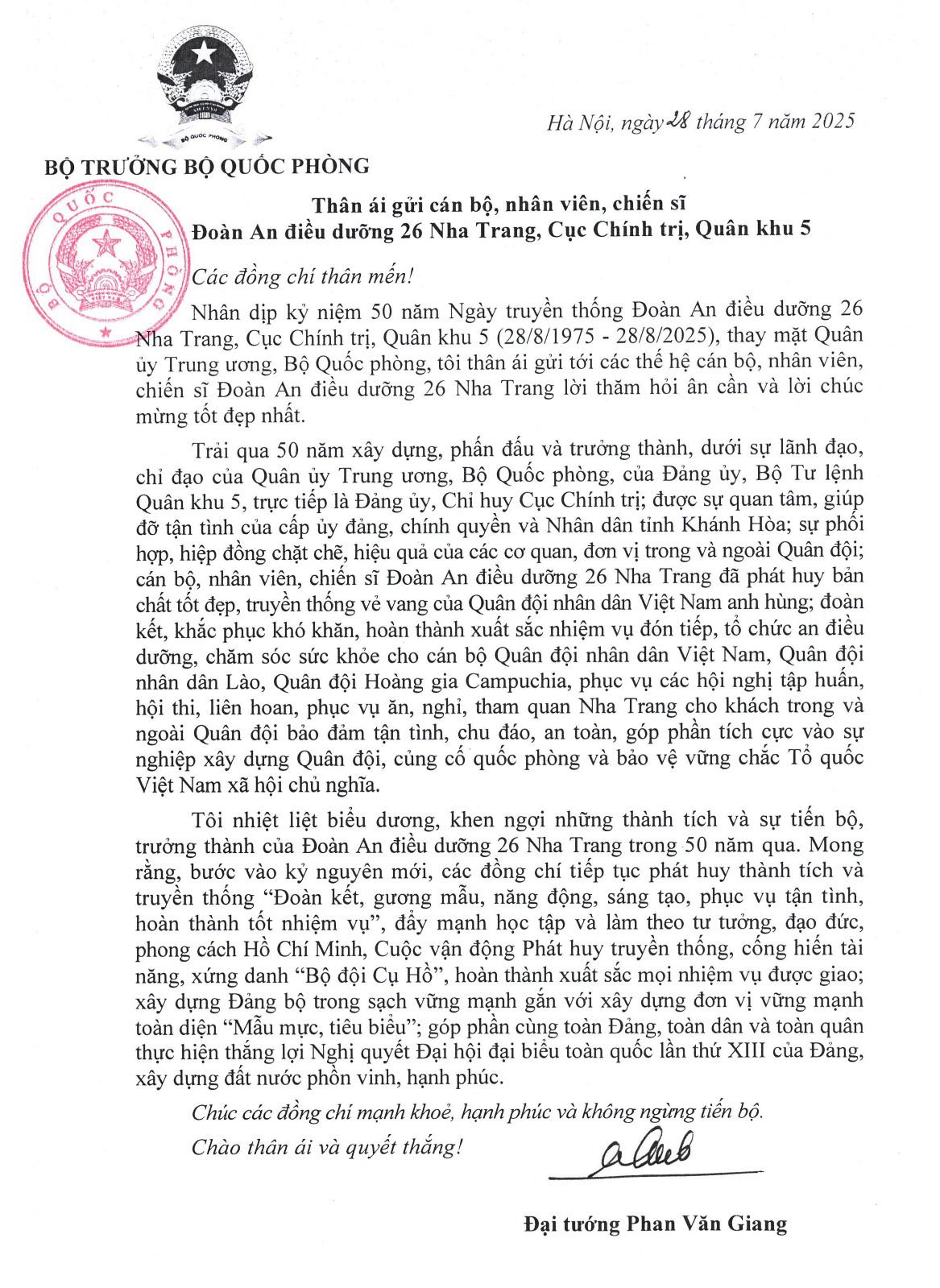 (Bqp.vn) - Nhân dịp kỷ niệm 50 năm Ngày truyền thống Đoàn An điều dưỡng 26 Nha Trang, Cục Chính trị, Quân khu 5 (28/8/1975 - 28/8/2025), Đại tướng Phan Văn Giang, Ủy viên Bộ Chính trị, Phó Bí thư Quân ủy Trung ương, Bộ trưởng Bộ Quốc phòng đã gửi thư chúc mừng tới các thế hệ cán bộ, nhân viên, chiến sĩ Đoàn An điều dưỡng 26 Nha Trang. Dưới đây là nội dung Thư của Đại tướng Phan Văn Giang: