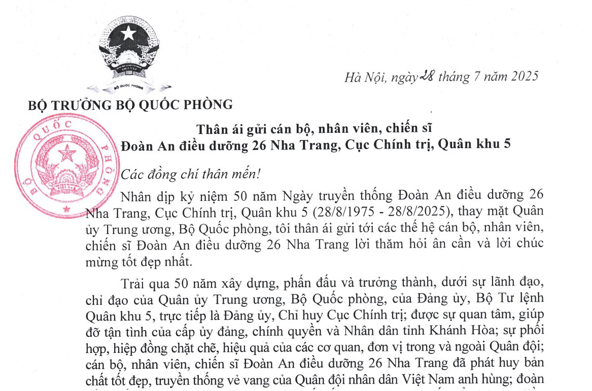 Nhân dịp kỷ niệm 50 năm Ngày truyền thống Đoàn An điều dưỡng 26 Nha Trang, Cục Chính trị, Quân khu 5 (28/8/1975 - 28/8/2025), thay mặt Quân ủy Trung ương, Bộ Quốc phòng, tôi thân ái gửi tới các thế hệ cán bộ, nhân viên, chiến sĩ Đoàn An điều dưỡng 26 Nha Trang lời thăm hỏi ân cần và lời chúc mừng tốt đẹp nhất.