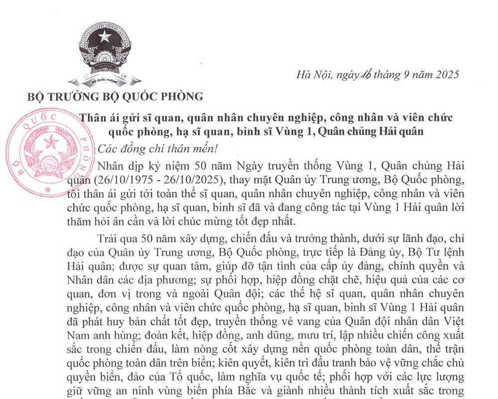 Nhân dịp kỷ niệm 50 năm Ngày truyền thống Vùng 1, Quân chủng Hải quân (26/10/1975 - 26/10/2025), thay mặt Quân ủy Trung ương, Bộ Quốc phòng, tôi thân ái gửi tới toàn thể sĩ quan, quân nhân chuyên nghiệp, công nhân và viên chức quốc phòng, hạ sĩ quan, binh sĩ đã và đang công tác tại Vùng 1 Hải quân lời thăm hỏi ân cần và lời chúc mừng tốt đẹp nhất.