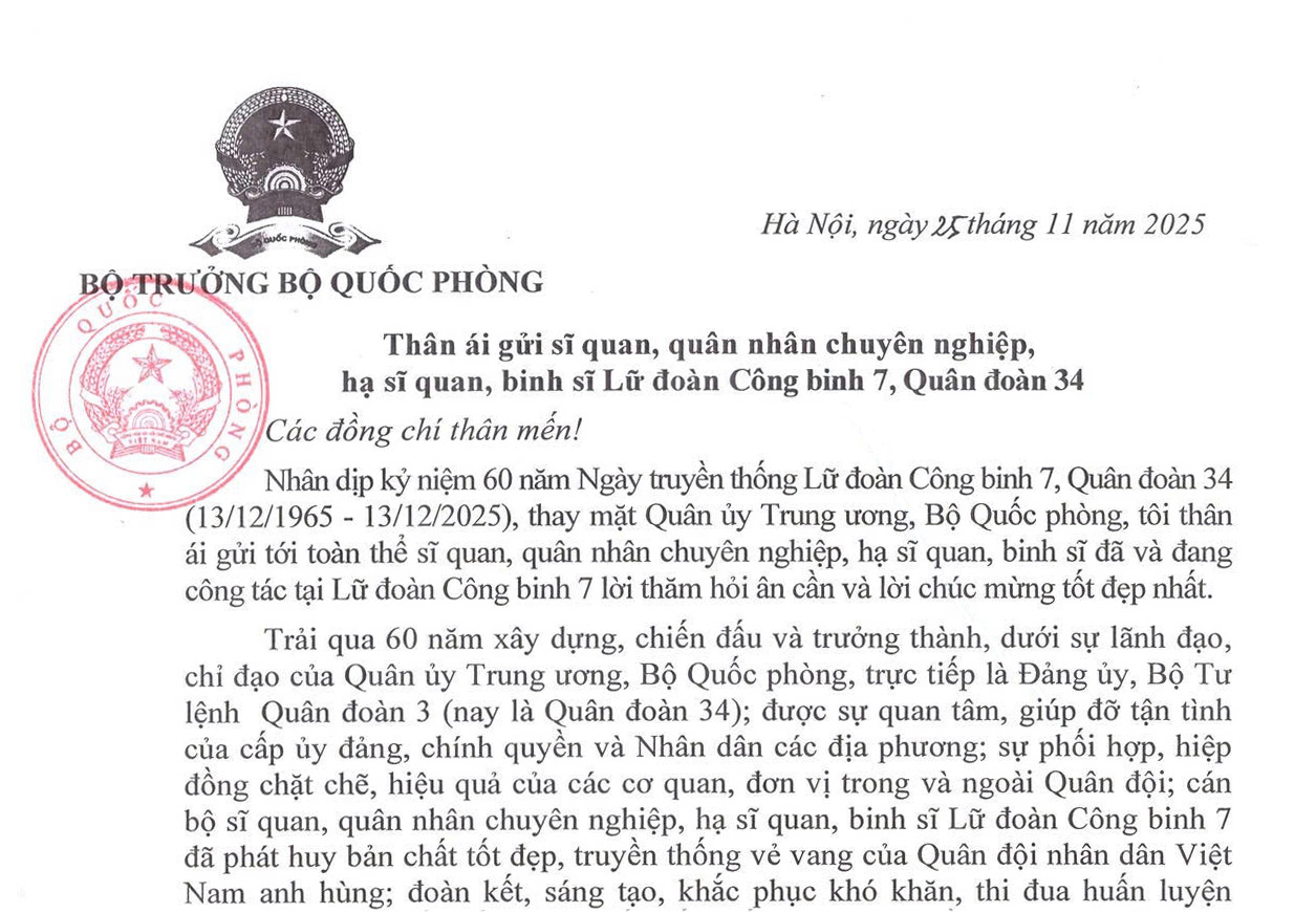 Nhân dịp kỷ niệm 60 năm Ngày truyền thống Lữ đoàn Công binh 7, Quân đoàn 34 (13/12/1965 - 13/12/2025), thay mặt Quân ủy Trung ương, Bộ Quốc phòng, tôi thân ái gửi tới toàn thể sĩ quan, quân nhân chuyên nghiệp, hạ sĩ quan, binh sĩ đã và đang công tác tại Lữ đoàn Công bình 7 lời thăm hỏi ân cần và lời chúc mừng tốt đẹp nhất.