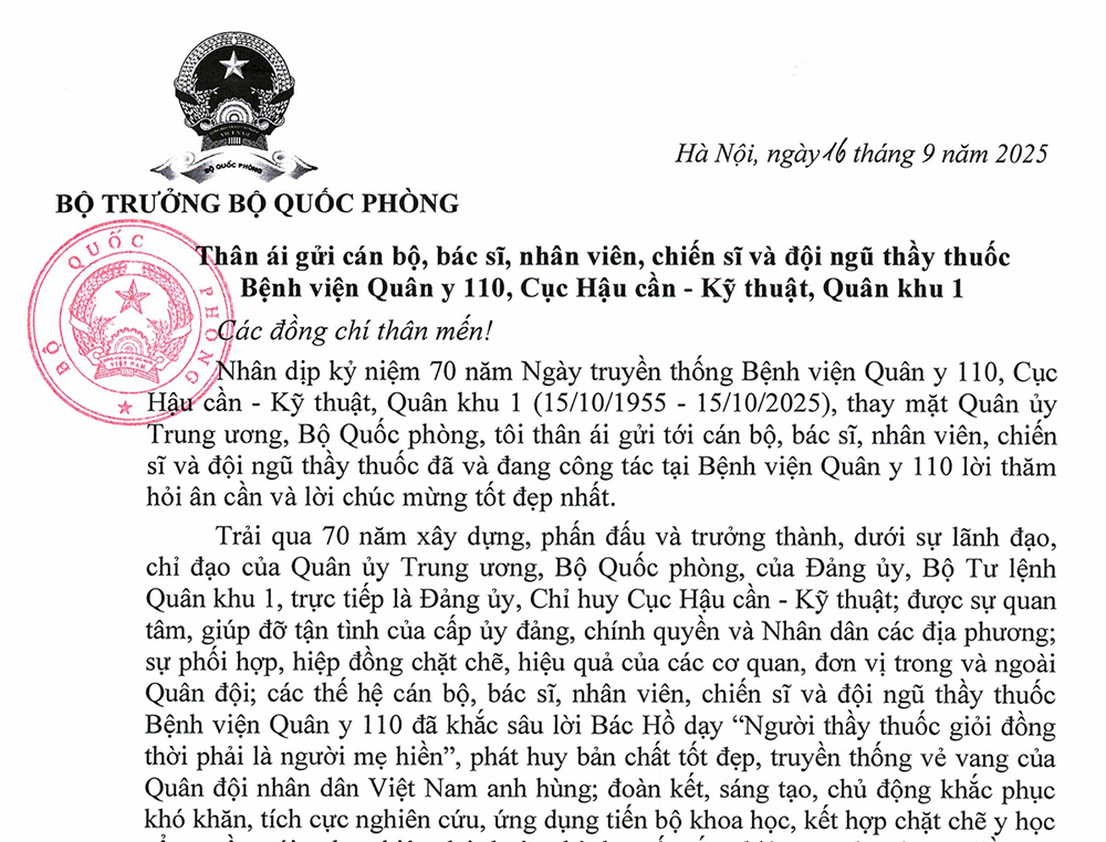 Nhân dịp kỷ niệm 70 năm Ngày truyền thống Bệnh viện Quân y 110, Cục Hậu cần - Kỹ thuật, Quân khu 1 (15/10/1955 - 15/10/2025), thay mặt Quân ủy Trung ương, Bộ Quốc phòng, tôi thân ái gửi tới cán bộ, bác sĩ, nhân viên, chiến sĩ và đội ngũ thầy thuốc đã và đang công tác tại Bệnh viện Quân y 110 lời thăm hỏi ân cần và lời chúc mừng tốt đẹp nhất.