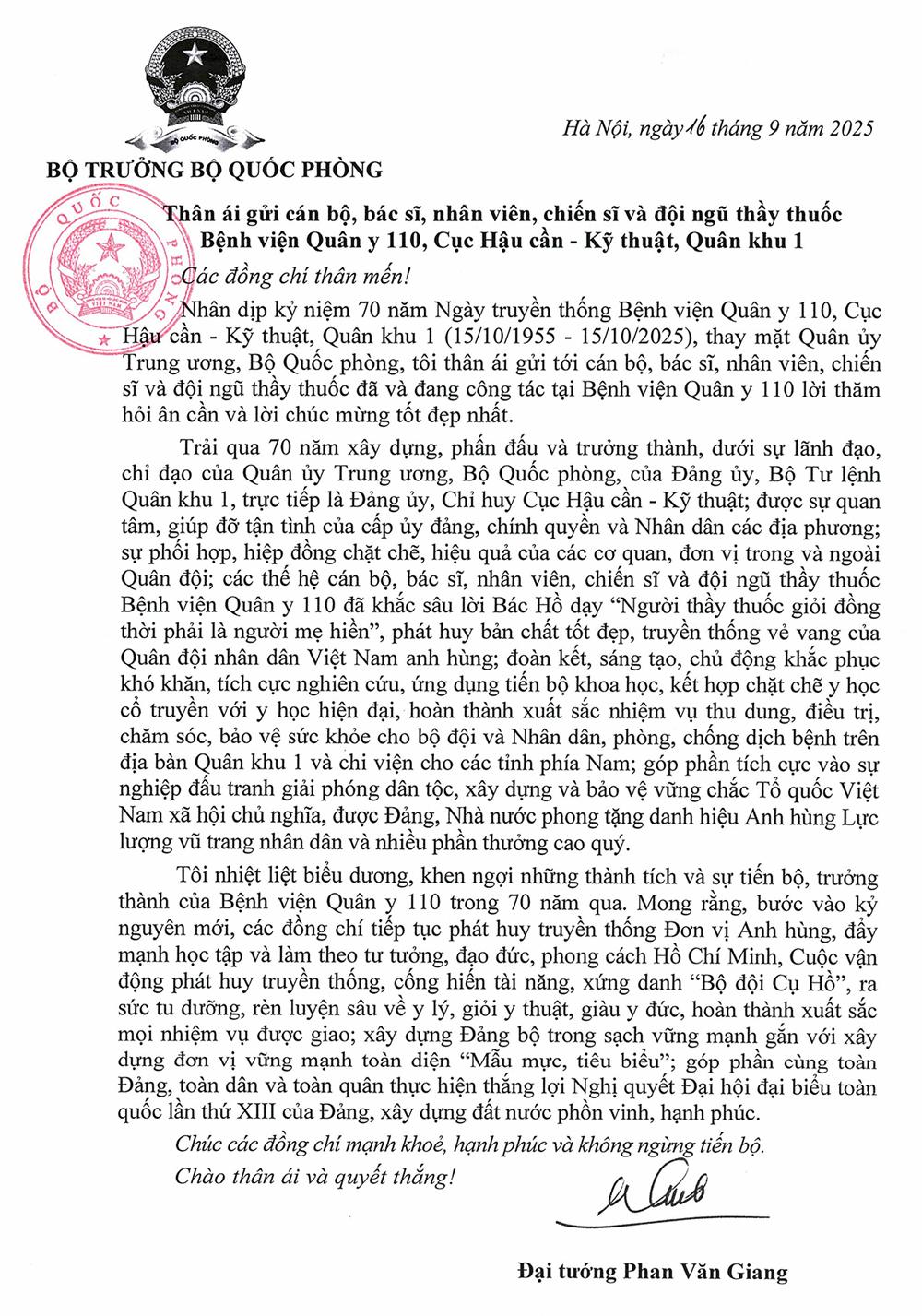 (Bqp.vn) - Nhân dịp kỷ niệm 70 năm Ngày truyền thống Bệnh viện Quân y 110, Cục Hậu cần - Kỹ thuật, Quân khu 1 (15/10/1955 - 15/10/2025), Đại tướng Phan Văn Giang, Ủy viên Bộ Chính trị, Phó Bí thư Quân ủy Trung ương, Bộ trưởng Bộ Quốc phòng đã gửi thư chúc mừng tới cán bộ, bác sĩ, nhân viên, chiến sĩ và đội ngũ thầy thuốc đã và đang công tác tại Bệnh viện Quân y 110. Dưới đây là nội dung Thư của Đại tướng Phan Văn Giang: