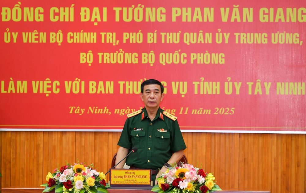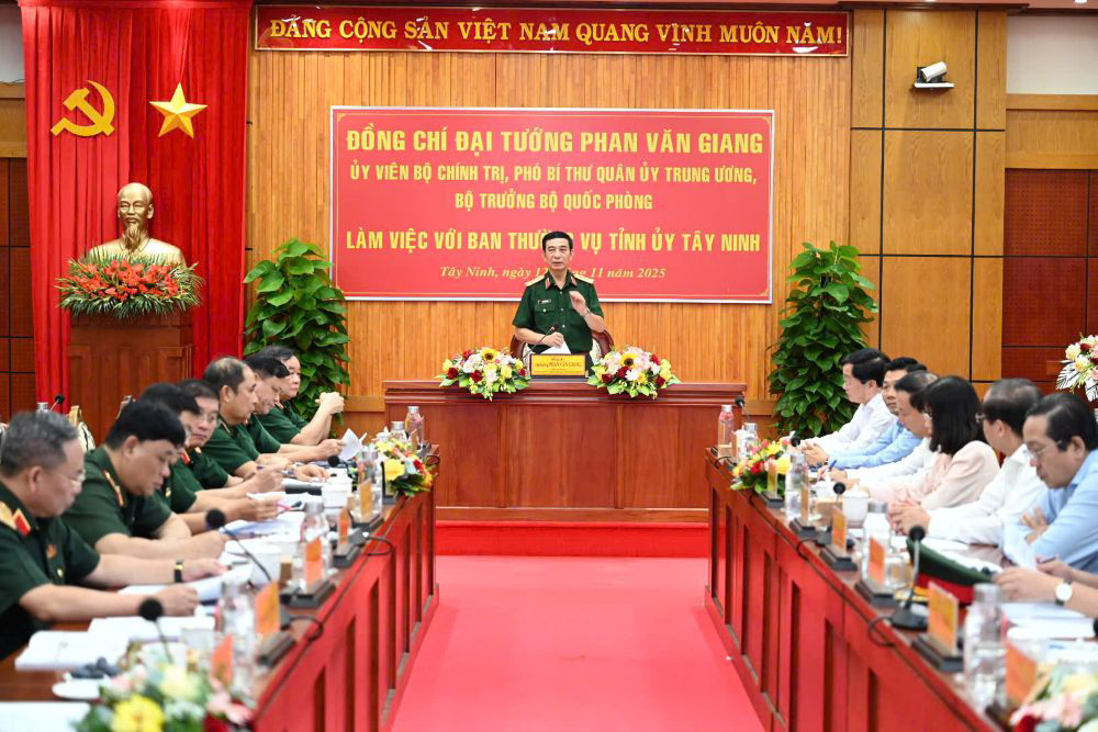 Phát biểu kết luận tại buổi làm việc, Đại tướng Phan Văn Giang bày tỏ vui mừng với những kết quả mà Đảng bộ, chính quyền, lực lượng vũ trang và nhân dân tỉnh Tây Ninh đã đạt được trong thời gian qua trên các lĩnh vực kinh tế - xã hội, quốc phòng, an ninh và đối ngoại nhân dân. Để hoàn thành tốt chỉ tiêu phát triển kinh tế - xã hội gắn với tăng cường quốc phòng, an ninh trên địa bàn, Đại tướng Phan Văn Giang đề nghị Tỉnh ủy Tây Ninh tiếp tục quán triệt sâu sắc đường lối, chủ trương của Đảng, chính sách, pháp luật của Nhà nước, chỉ thị, nghị quyết của Quân ủy Trung ương, Bộ Quốc phòng về nhiệm vụ bảo vệ Tổ quốc. Nâng cao tinh thần cảnh giác cách mạng; chủ động đấu tranh làm thất bại âm mưu, hoạt động “diễn biến hòa bình” của các thế lực thù địch. Tập trung lãnh đạo, chỉ đạo thực hiện có hiệu quả Nghị quyết Trung ương 4 khóa XI, khóa XII và Kết luận số 21-KL/TW ngày 25/10/2021 của Ban Chấp hành Trung ương về đẩy mạnh xây dựng, chỉnh đốn Đảng và hệ thống chính trị. Đẩy mạnh học tập và làm theo tư tưởng, đạo đức, phong cách Hồ Chí Minh. Thực hiện tốt quy định nêu gương, nhất là cán bộ chủ trì, chủ chốt các cấp. Chăm lo xây dựng, đào tạo đội ngũ cán bộ lãnh đạo, quản lý các cấp có phẩm chất và năng lực đáp ứng yêu cầu xây dựng, phát triển của tỉnh.