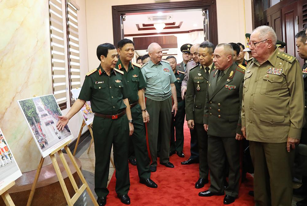 Đại tướng Phan Văn Giang cùng lãnh đạo Quân đội, Bộ Quốc phòng các nước tham quan khu trưng bày ảnh giới thiệu các hoạt động chào mừng Quốc khánh 2/9.