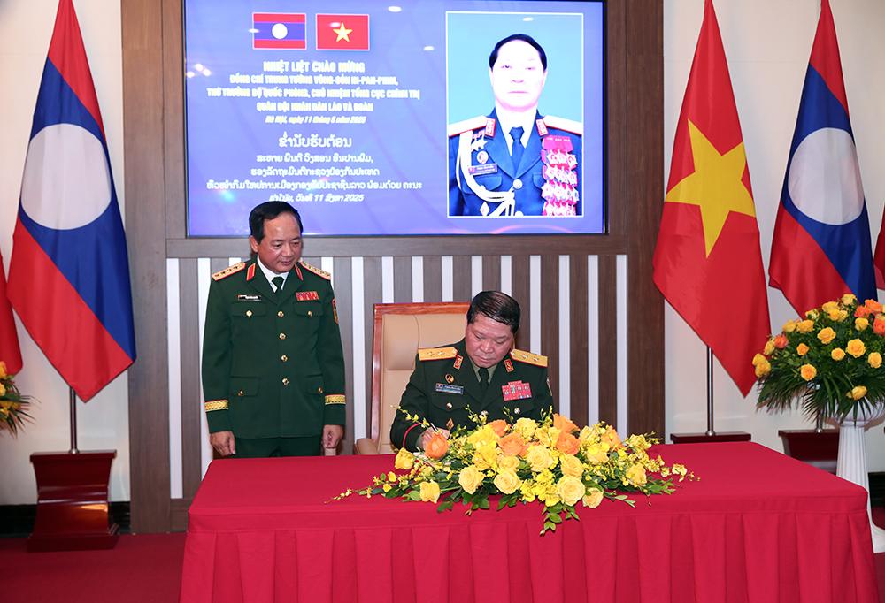 Trung tướng Vongsone Inpanphim ghi sổ lưu niệm.