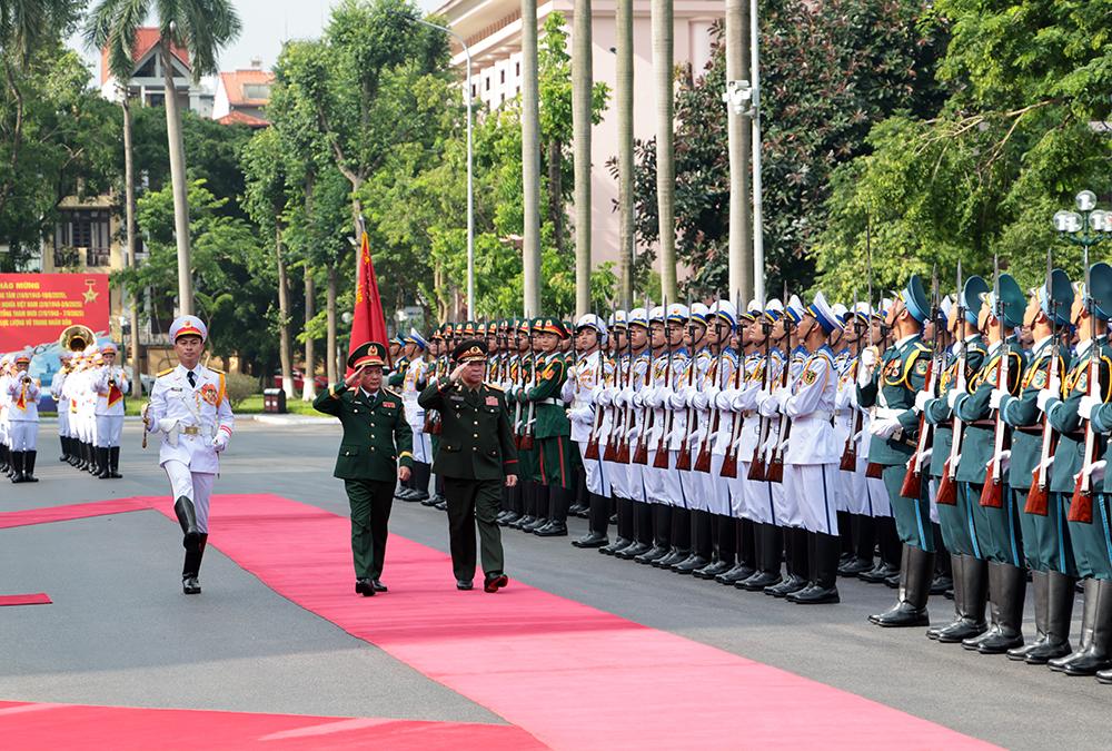 Đại tướng Trịnh Văn Quyết và Trung tướng Vongsone Inpanphim duyệt Đội danh dự Quân đội nhân dân Việt Nam.