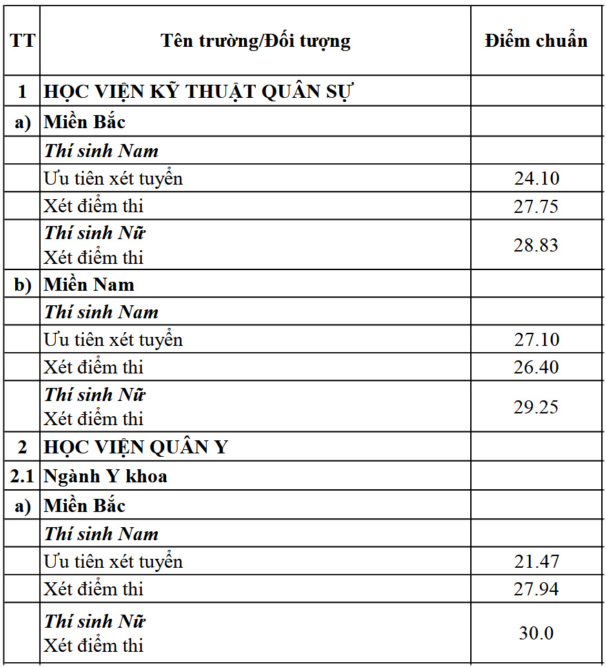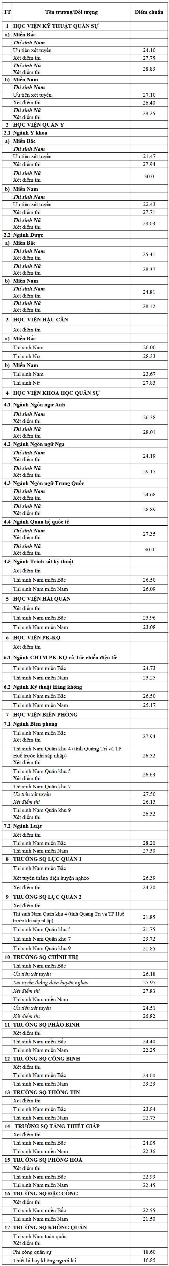 1. Điểm chuẩn tuyển sinh đại học quân sự năm 2025