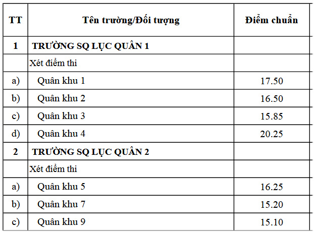 Điểm chuẩn tuyển sinh đại học, cao đẳng quân sự hệ chính quy vào các trường Quân đội năm 2025