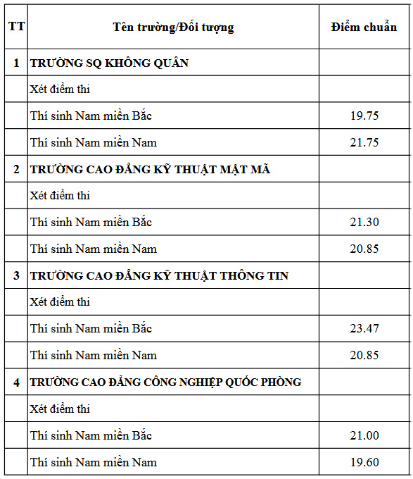 5. Căn cứ vào điểm chuẩn trên, các trường tổ chức công bố điểm trúng tuyển, danh sách thí sinh trúng tuyển và triệu tập thí sinh trúng tuyển nhập học theo quy định của Ban Tuyển sinh quân sự Bộ Quốc phòng.