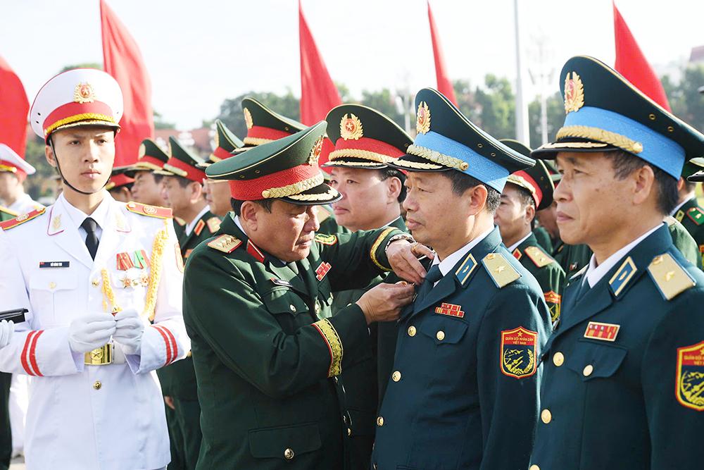 Thượng tướng Trương Thiên Tô trao Huy hiệu Bác Hồ tặng các đại biểu.