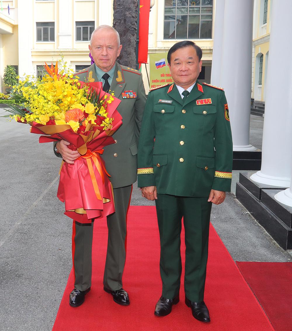 Thượng tướng Hoàng Xuân Chiến tặng hoa chào mừng Thượng tướng Alexander Vasilyevich Fomin đồng chủ trì Đối thoại Chiến lược quốc phòng Việt Nam - Liên bang Nga lần thứ 8.