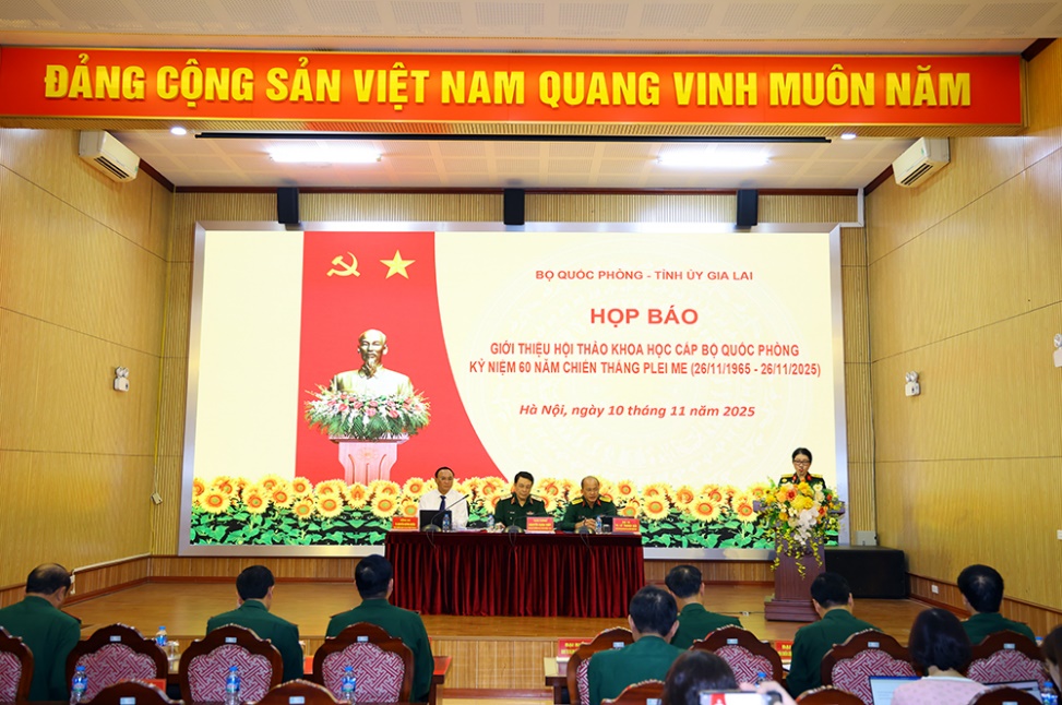 (Bqp.vn) - Chiều 10/11, tại Hà Nội, Bộ Quốc phòng phối hợp với Tỉnh ủy Gia Lai tổ chức Họp báo giới thiệu Hội thảo khoa học cấp Bộ Quốc phòng kỷ niệm 60 năm chiến thắng Plei Me (26/11/1965 - 26/11/2025), Thiếu tướng Nguyễn Xuân Thủy, Phó Cục trưởng Cục Tuyên huấn (Tổng cục Chính trị); Phó Trưởng Ban Tuyên giáo và Dân vận Tỉnh ủy Gia Lai Nguyễn Đình Huyện và Đại tá Lê Thanh Bài, Phó Viện trưởng Viện Chiến lược và Lịch sử quốc phòng Việt Nam đồng chủ trì họp báo.