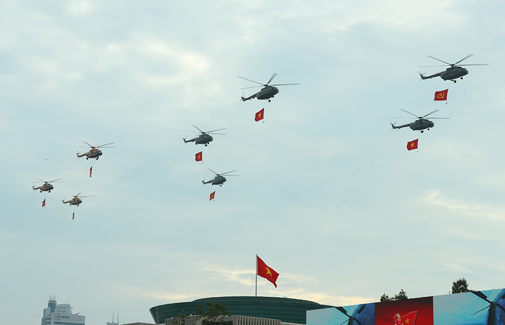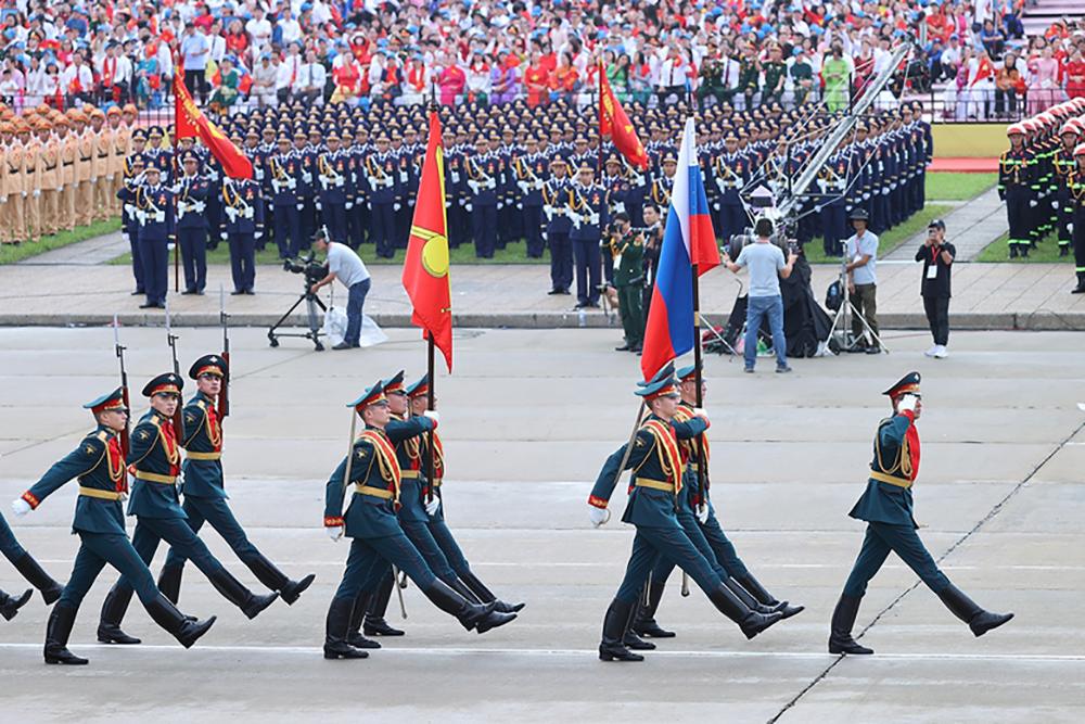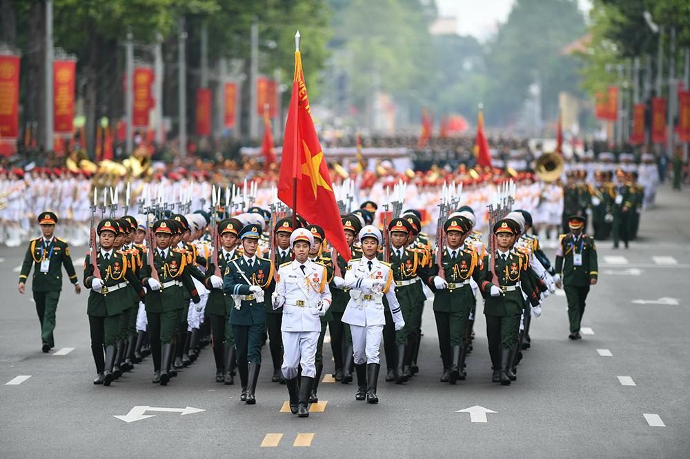 Ngay sau phần lễ, cuộc diễu binh, diễu hành đã diễn ra trang nghiêm và hoành tráng. Đây là điểm nhấn quan trọng, thể hiện sức mạnh, bản lĩnh, niềm tự hào và tinh thần đoàn kết của toàn dân tộc Việt Nam. Hàng vạn cán bộ, chiến sĩ Quân đội nhân dân, Công an nhân dân cùng các lực lượng Dân quân tự vệ, Thanh niên xung phong tiến bước trong đội hình hùng dũng, uy nghi. Những khối quân, binh chủng hiện đại, những đoàn xe cơ giới với các loại vũ khí, khí tài được sản xuất, cải tiến trong nước đã khẳng định tiềm lực quốc phòng ngày càng vững mạnh, đủ sức bảo vệ Tổ quốc trong mọi tình huống.