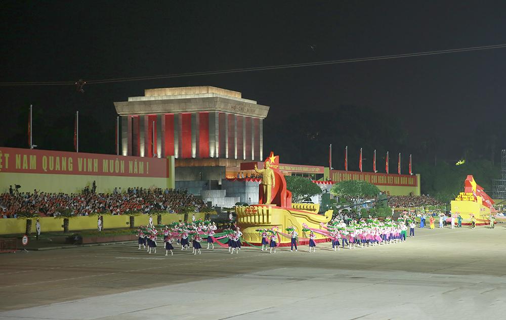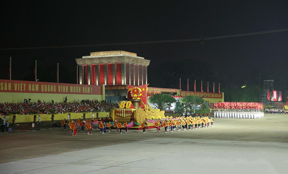 Xe mô hình biểu tượng 80 năm Cách mạng tháng Tám và Quốc khánh nước Cộng hòa xã hội chủ nghĩa Việt Nam tiến qua lễ đài.