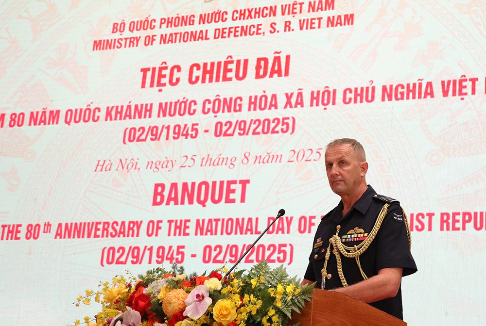 Thay mặt cho các đại biểu quốc tế tham dự tiệc chiêu đãi, Đại tá Mick Jansen, Tùy viên Quốc phòng Ô-xtrây-li-a, Trưởng đoàn Tùy viên Quân sự các nước tại Việt Nam gửi tới Chính phủ, lực lượng vũ trang và nhân dân Việt Nam những lời chúc mừng nồng nhiệt nhất nhân dịp kỷ niệm 80 năm Quốc khánh.