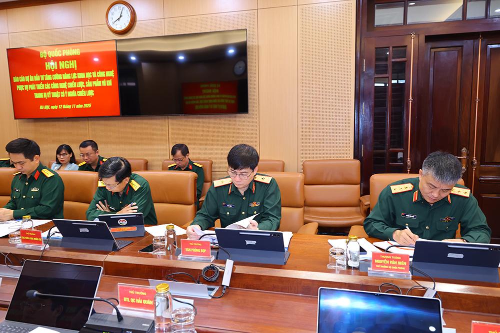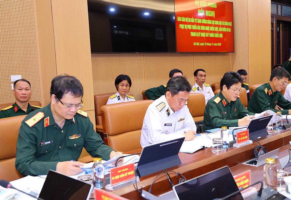 (Bqp.vn) - Sáng 12/11, tại Hà Nội, Thượng tướng Lê Huy Vịnh, Ủy viên Trung ương Đảng, Thứ trưởng Bộ Quốc phòng chủ trì Hội nghị báo cáo dự án đầu tư tăng cường năng lực khoa học và công nghệ phục vụ phát triển các công nghệ chiến lược, sản phẩm vũ khí trang bị kỹ thuật có ý nghĩa chiến lược. Tham dự hội nghị có Thượng tướng Nguyễn Văn Hiền, Ủy viên Trung ương Đảng, Thứ trưởng Bộ Quốc phòng, đại diện một số cơ quan, đơn vị thuộc Bộ Quốc phòng và Quân chủng Hải quân.