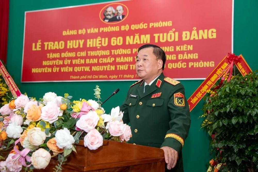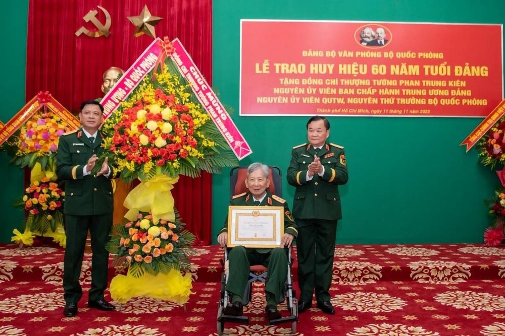 (Bqp.vn) - Sáng 11/ 11, tại Thành phố Hồ Chí Minh, Đảng bộ Văn phòng Bộ Quốc phòng tổ chức Lễ trao Huy hiệu 60 năm tuổi Đảng tặng Thượng tướng Phan Trung Kiên, nguyên Ủy viên Trung ương Đảng, nguyên Thứ trưởng Bộ Quốc phòng. Thượng tướng Hoàng Xuân Chiến, Ủy viên Trung ương Đảng, Ủy viên Thường vụ Quân ủy Trung ương, Thứ trưởng Bộ Quốc phòng chủ trì buổi lễ.