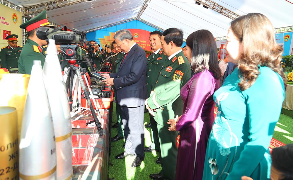 Tổng Bí thư Tô Lâm và các đại biểu tham quan các sản phẩm, mô hình, học cụ của Quân khu 1 được trưng bày tại lễ kỷ niệm.