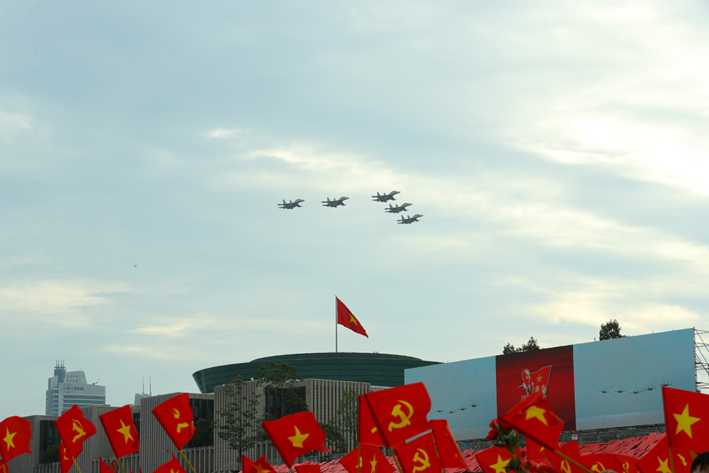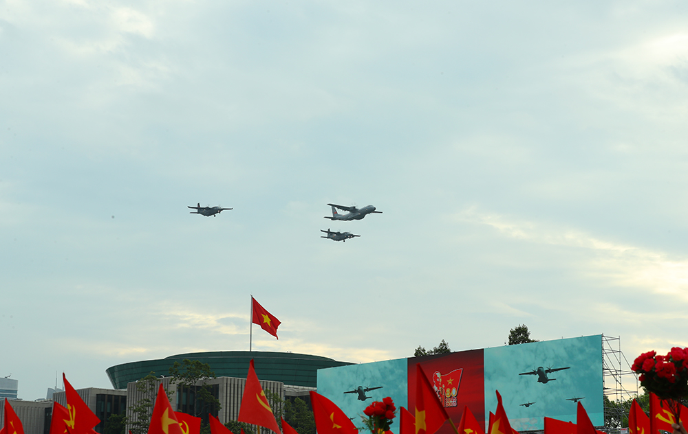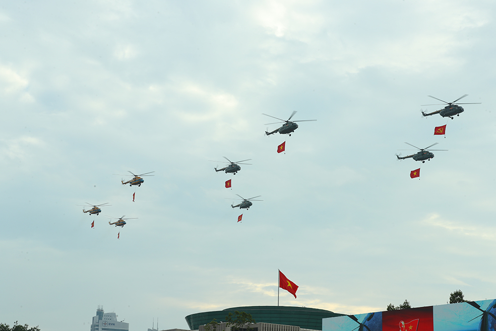 Mở đầu tổng duyệt diễu binh, diễu hành là các Biên đội của Không quân nhân dân Việt Nam anh hùng bay trên bầu trời Tổ quốc. Dẫn đầu là biên đội trực thăng Mi-171, Mi-17, Mi-8, mang theo cờ Đảng, cờ Tổ quốc tung bay trên Quảng trường Ba Đình lịch sử, biểu tượng cho sức mạnh đại đoàn kết, niềm tự hào của Đảng và dân tộc, thể hiện bản lĩnh, trí tuệ, khát vọng xây dựng đất nước cất cánh, vươn cao trong kỷ nguyên mới. Tiếp đó, đội hình máy bay vận tải Casa C-295 và C212i - những “chiến binh thầm lặng”, đảm nhiệm hiệp đồng chiến đấu, trinh sát, vận chuyển, tìm kiếm cứu nạn. Góp mặt trong khối bay chào mừng còn có Yak-130, L-39NG và Su-30MK2. Cùng với đó, tại tổng duyệt có phần thuyết minh, giới thiệu trên màn hình về các lực lượng vũ trang diễu binh trên biển tại Căn cứ quân sự Cam Ranh (tỉnh Khánh Hòa).