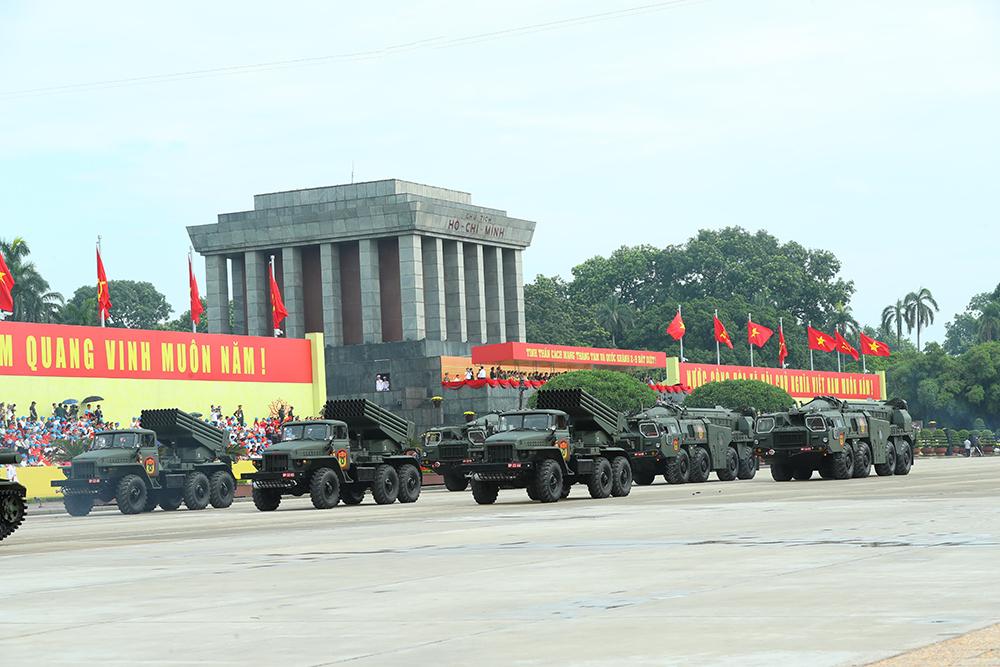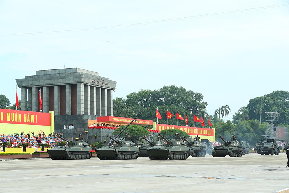 Các khối xe, pháo quân sự tiến qua lễ đài.
