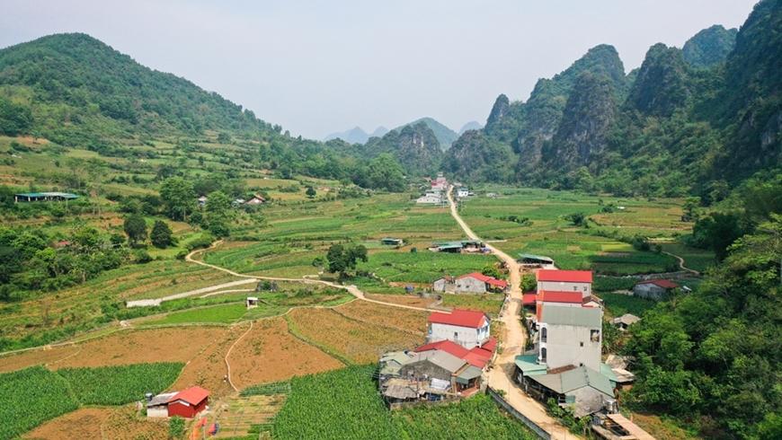 | Con đường bê tông và những ngôi nhà mới ở xóm Canh Biện thuộc xã Nguyễn Huệ (tỉnh Cao Bằng) |