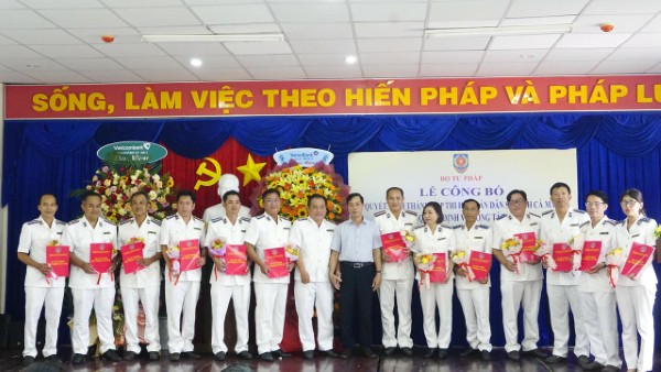 Thứ trưởng Bộ Tư pháp Nguyễn Thanh Ngọc và ông Phan Hoàng Vũ, Phó Chủ tịch HĐND tỉnh Cà Mau, trao Quyết định và tặng hoa chúc mừng 5 lãnh đạo THADS tỉnh Cà Mau.