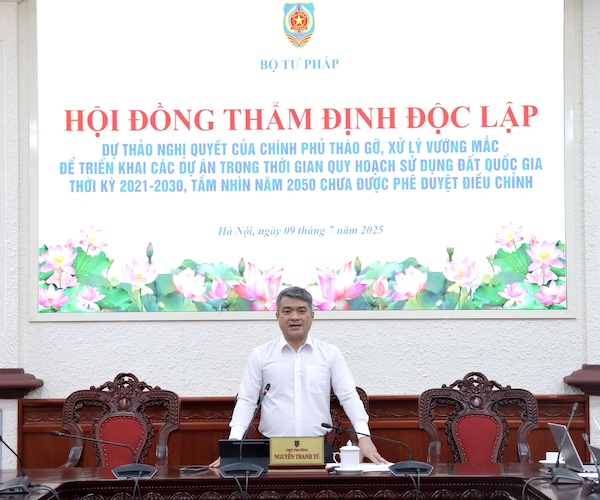 Chiều 9/7, Thứ trưởng Bộ Tư pháp Nguyễn Thanh Tú chủ trì Hội đồng thẩm định độc lập dự thảo Nghị quyết của Chính phủ tháo gỡ, xử lý vướng mắc để triển khai các dự án trong thời gian Quy hoạch sử dụng đất quốc gia thời kỳ 2021-2030, tầm nhìn đến năm 2050 chưa được phê duyệt điều chỉnh.