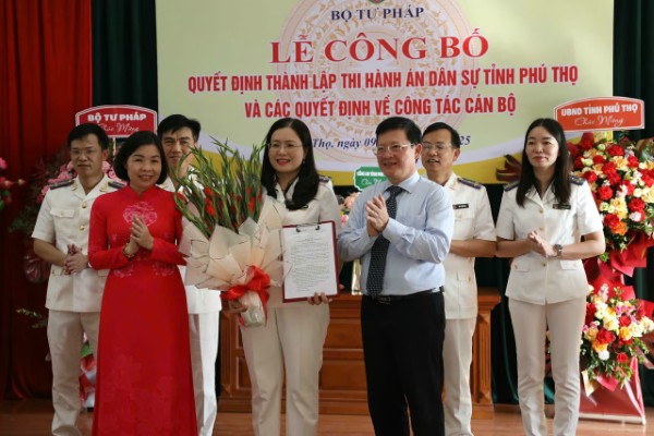 Sáng 9/7, tại trụ sở Thi hành án dân sự (THADS) tỉnh Phú Thọ, Bộ Tư pháp đã tổ chức Lễ công bố quyết định thành lập cơ quan THADS tỉnh Phú Thọ và trao các quyết định về công tác cán bộ.