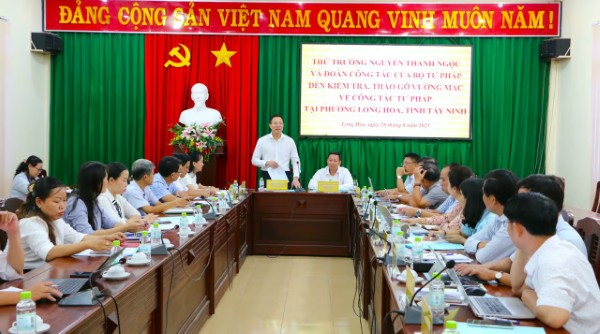 Thực hiện Công văn số 5135/BTP-HCTP ngày 20/8/2025 của Bộ Tư pháp về việc kiểm tra, hướng dẫn tháo gỡ khó khăn, vướng mắc trong thực hiện mô hình chính quyền hai cấp trong lĩnh vực hộ tịch, Thứ trưởng Bộ Tư pháp Nguyễn Thanh Ngọc và Đoàn công tác Bộ Tư pháp đã có buổi làm việc với hai xã Châu Thành và phường Long Hoa, Tây Ninh, ngày 26/8/2025.