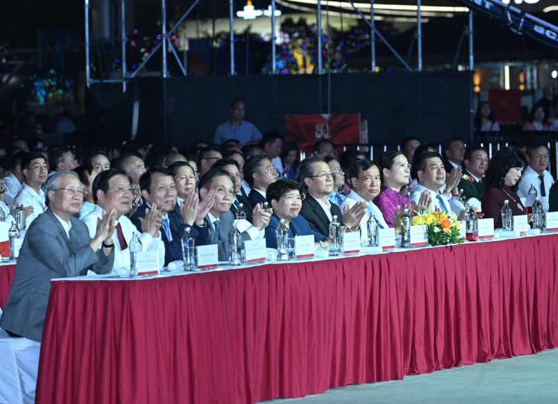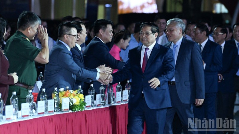 Thủ tướng Phạm Minh Chính và các đồng chí lãnh đạo, các đại biểu tham dự buổi lễ. (Ảnh: TRẦN HẢI)