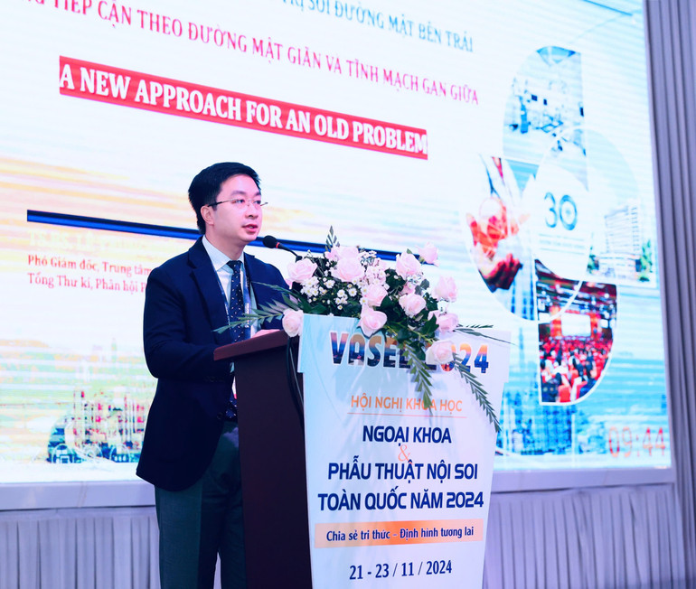 Tiến sĩ, bác sĩ Lê Trung Hiếu báo cáo tại Hội nghị Ngoại khoa và Phẫu thuật Nội soi toàn quốc năm 2024.