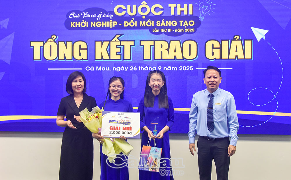 Tiến sĩ Tiền Hải Lý và Tiến sĩ Nguyễn Hồng Nhung, Hiệu trưởng Trường Cao đẳng Cộng đồng Cà Mau trao giải Nhì cho nhóm tác giả của ý tưởng “Website vitamin thú cưng”.