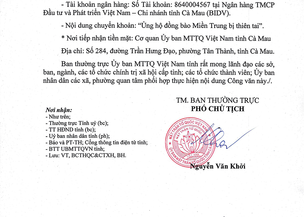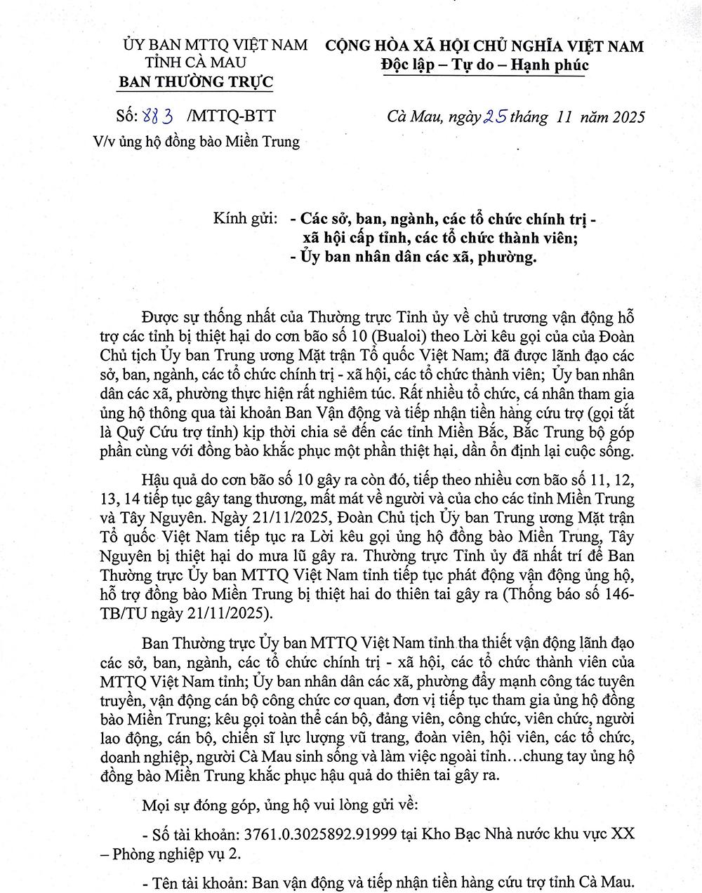 Thứ ba, 25/11/2025 | 11:13 A- A A+ | Ban Thường trực Ủy ban MTTQ Việt Nam tỉnh Cà Mau phát động vận động ủng hộ, hỗ trợ đồng bào miền Trung bị thiệt hại do thiên tai gây ra baocamau.vn Từ khóa: báo Cà Mau Cà Mau tin mới Cà Mau thời sự Cà Mau tin tức Cà Mau ủng hộ thiên tai Miền Trung Các tin khác Hòn Khoai đang gọi chúng ta tiến bước! Kế hoạch triển khai các nghị quyết phải cụ thể, sát thực tế Phó Thủ tướng Hồ Quốc Dũng: Cộng đồng người Việt tại Cuba là cầu nối vun đắp quan hệ hai nước Đoàn cán bộ Cà Mau làm việc với lãnh đạo tỉnh Khăm Muồn Cần đổi mới phương thức tuyên truyền nghị quyết của Đảng Đoàn kiểm tra của Tỉnh uỷ làm việc với xã Phước Long