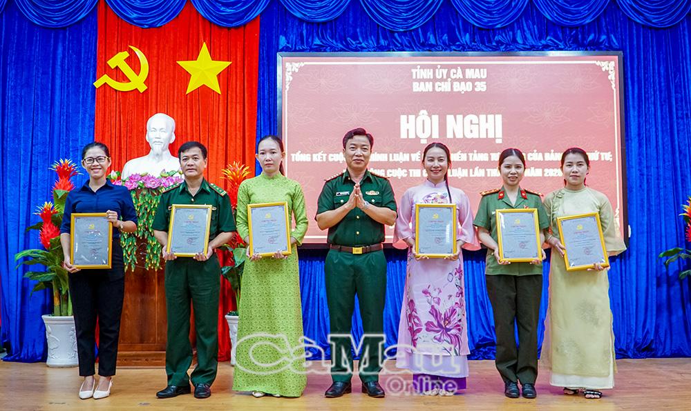 Hiệu trưởng Trường Chính trị tỉnh Cà Mau Dương Văn Thạnh trao giải C cho các tác giả.