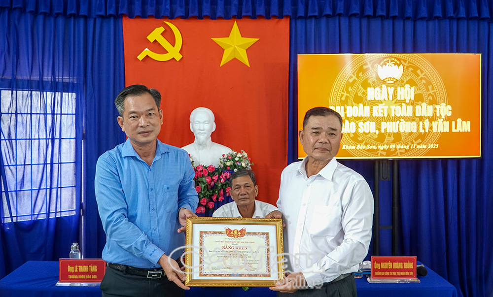Đại diện lãnh đạo Uỷ ban MTTQ Việt Nam tỉnh Cà Mau trao Bằng khen của Uỷ ban MTTQ tỉnh tặng Ban công tác Mặt trận khóm Bào Sơn vì có thành tích xuất sắc trong tổ chức Ngày hội Đại đoàn kết toàn dân tộc năm 2025; lãnh đạo phường trao khen thưởng các tập thể, cá nhân và gia đình tiêu biểu của khóm.