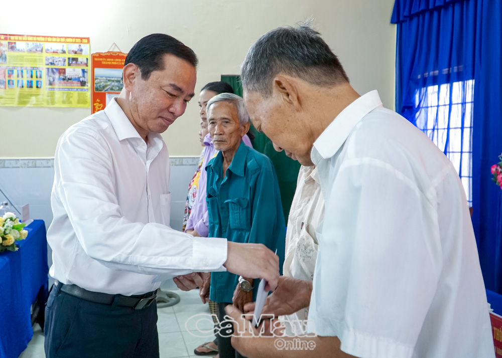 Trưởng ban Tổ chức Tỉnh uỷ Phan Thanh Duy trao quà của tỉnh tặng Ban công tác Mặt trận và người dân khóm Bào Sơn.