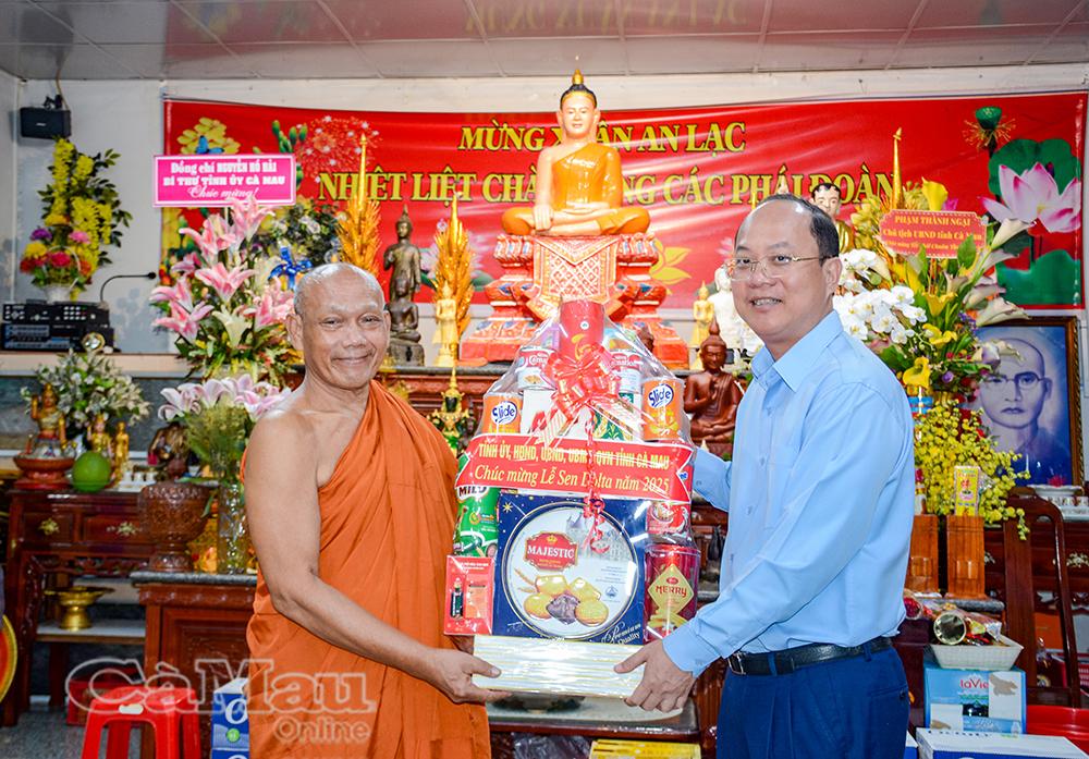 Đồng chí Nguyễn Thu Tư, Giám đốc Sở Dân tộc và Tôn giáo tỉnh, tặng quà Ban quản trị Chùa Monivongsa Bopharam.
