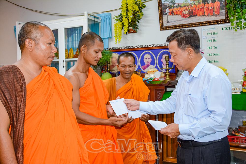 Dịp này, đồng chí Bí thư Tỉnh uỷ trao tặng phần quà của Tỉnh uỷ, HĐND, UBND, Uỷ ban MTTQ Việt Nam tỉnh đến Hội Đoàn kết sư sãi yêu nước, Ban Quản trị chùa Monivongsa Bopharam và cá nhân các vị sư sãi.