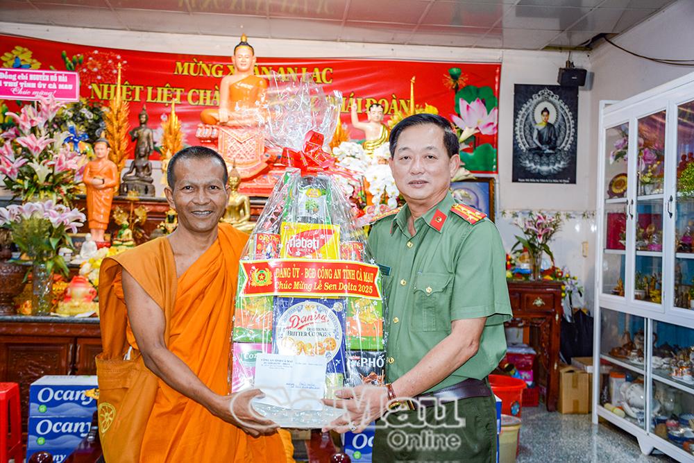 Đại tá Nguyễn Phúc Cường, Phó Giám đốc Công an tỉnh, tặng quà Hội đoàn kết sư sãi yêu nước tỉnh.
