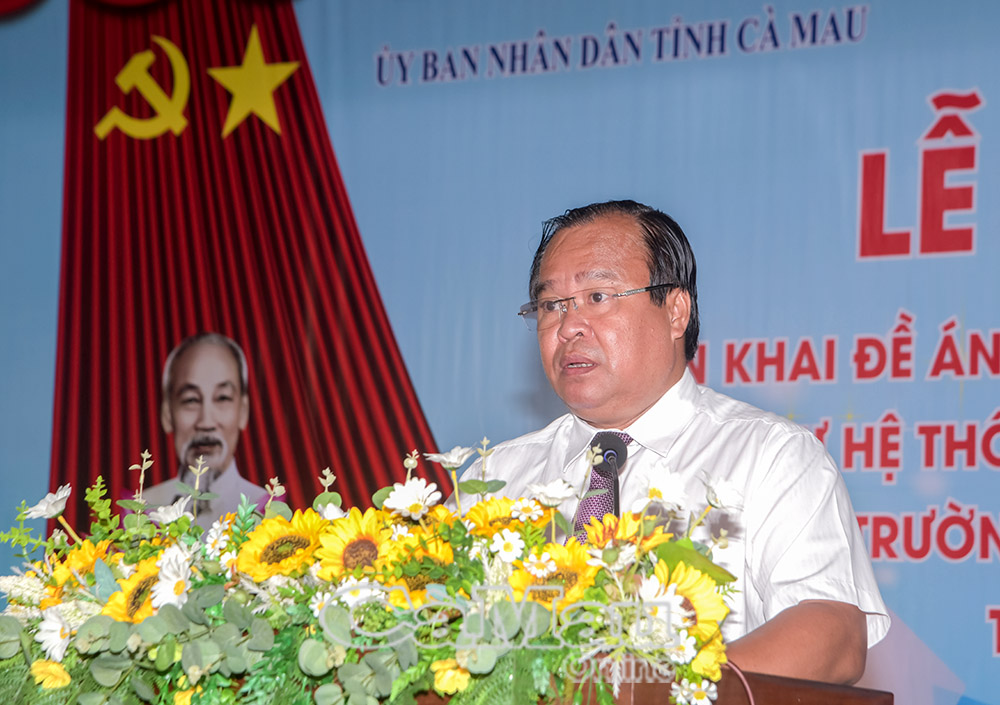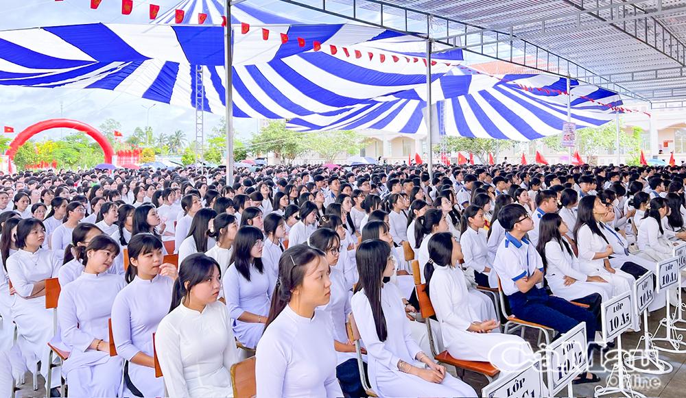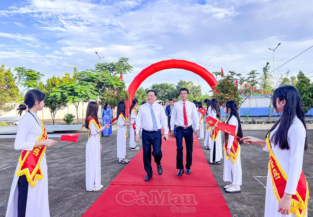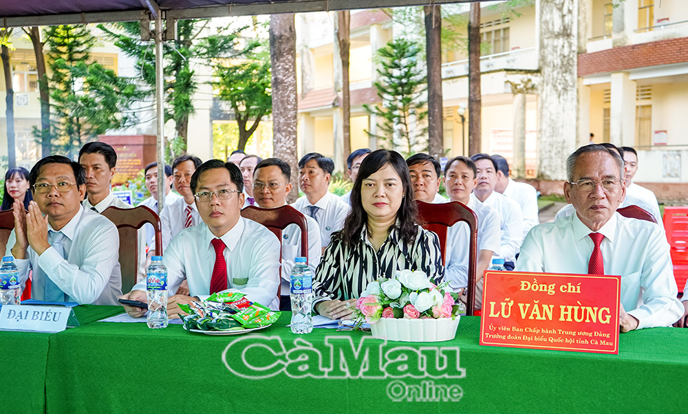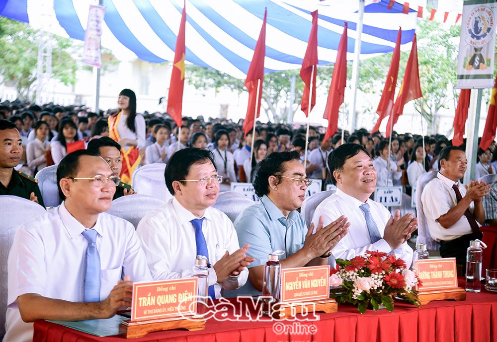 Đồng chí Lữ Văn Hùng, Uỷ viên BCH Trung ương Đảng, Trưởng đoàn Đại biểu Quốc hội tỉnh Cà Mau (bìa phải) dự Lễ khai giảng năm học mới tại Trường THPT chuyên Phan Ngọc Hiển.