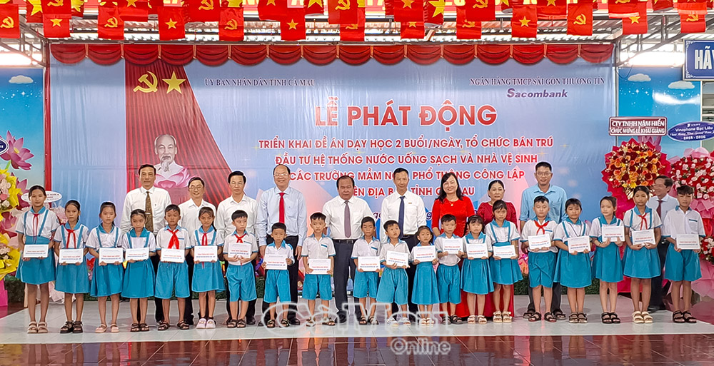 Tại buổi lễ, Sacombank trao tặng 10 tỷ đồng đầu tư hệ thống nước sạch, nhà vệ sinh trường học; Hội Khuyến học tỉnh trao 20 suất học bổng (1 triệu đồng/suất) cho học sinh khó khăn.
