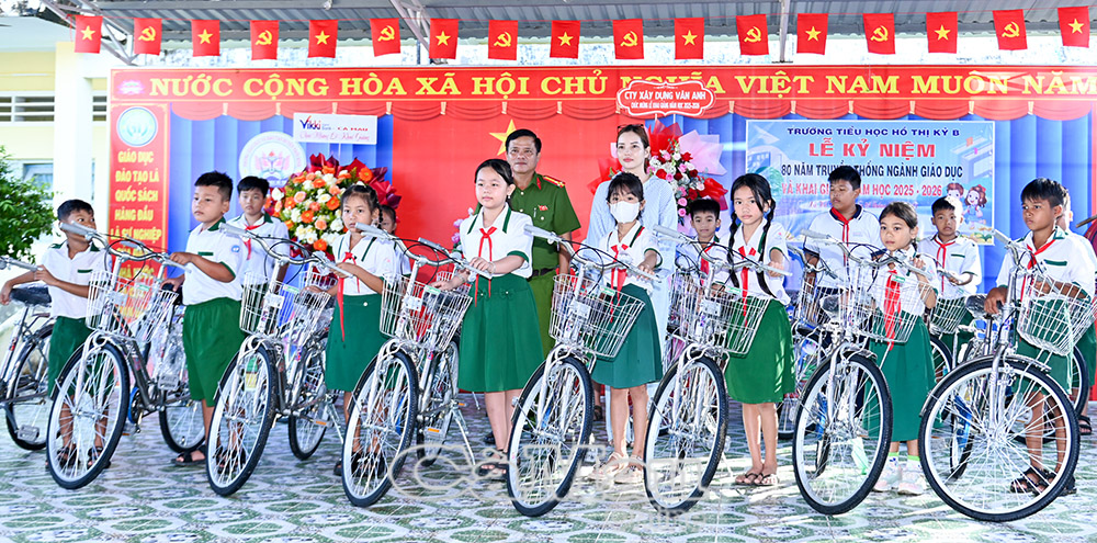 Trong không khí rộn ràng của ngày khai trường, đồng chí Huỳnh Quốc Việt cùng lãnh đạo địa phương, cán bộ, giáo viên và hơn 300 học sinh chung vui, động viên thầy trò nhà trường bước vào năm học mới. Dịp này, đồng chí trao 10 xe đạp và 45 suất học bổng cho học sinh có hoàn cảnh khó khăn, tiếp thêm động lực để các em phấn đấu vươn lên trong học tập.