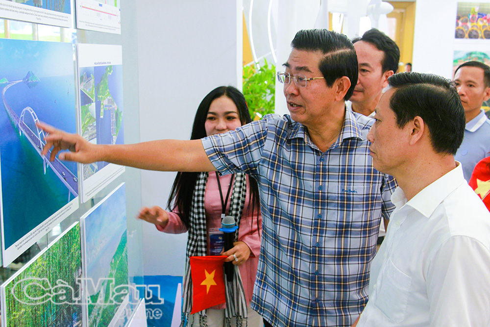 Tại gian trưng bày, đoàn được nghe thuyết minh viên của Sở Văn hóa, Thể thao và Du lịch tỉnh Cà Mau giới thiệu chi tiết về chủ đề “Dạt dào vùng đất Cà Mau – 80 năm Quốc khánh, tự hào quê ta”.