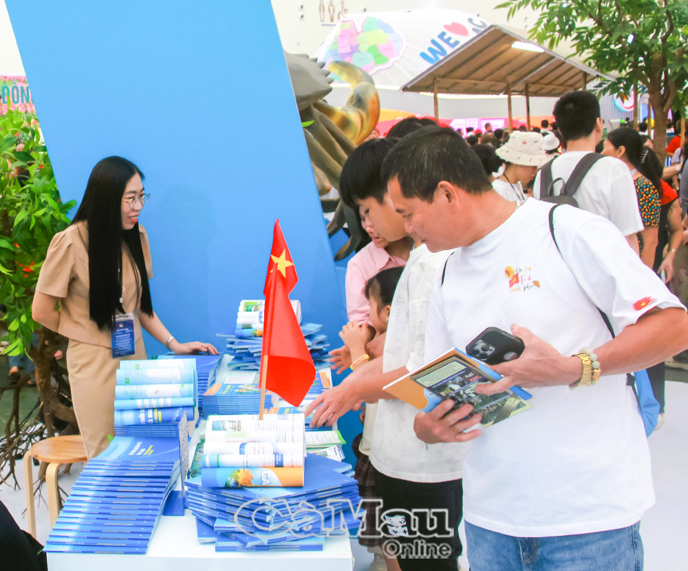Khách tham quan triển lãm tìm hiểu về Cà Mau qua ấn phẩm in.