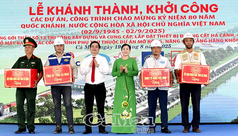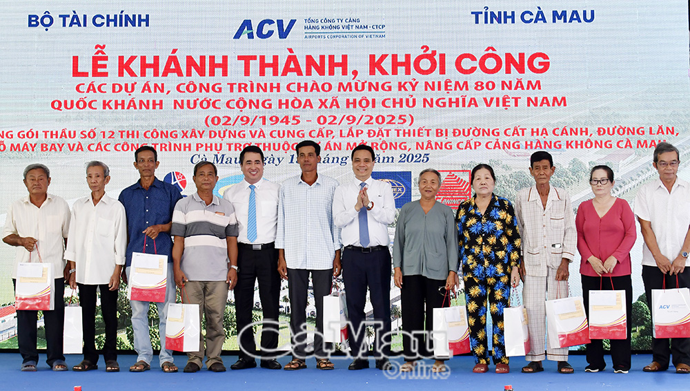 Dịp này, lãnh đạo tỉnh Cà Mau và ACV trao tặng quà cho 10 hộ dân tiêu biểu trong công tác bàn giao mặt bằng cho dự án và tặng quà động viên cho các nhà thầu.