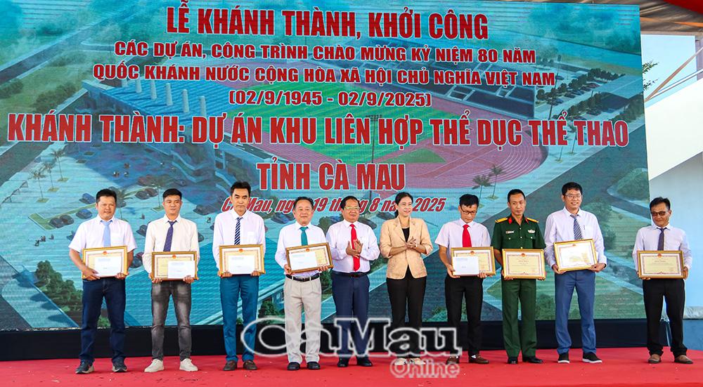 Dịp này, UBND tỉnh tặng bằng khen cho 8 tập thể có thành tích xuất sắc trong việc triển khai xây dựng Khu Liên hợp TDTT tỉnh Cà Mau.
